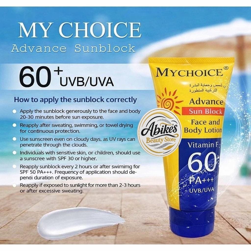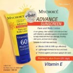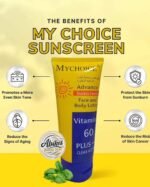 MyChoice Advance Sunscreen SPF 60 PA+++ is a high-performance face and body sunscreen designed to protect your skin from harmful UVA and UVB rays while keeping it nourished, smooth, and comfortable all day long. Formulated with a lightweight, non-greasy texture, it absorbs easily into the skin without leaving white residue or clogging pores.