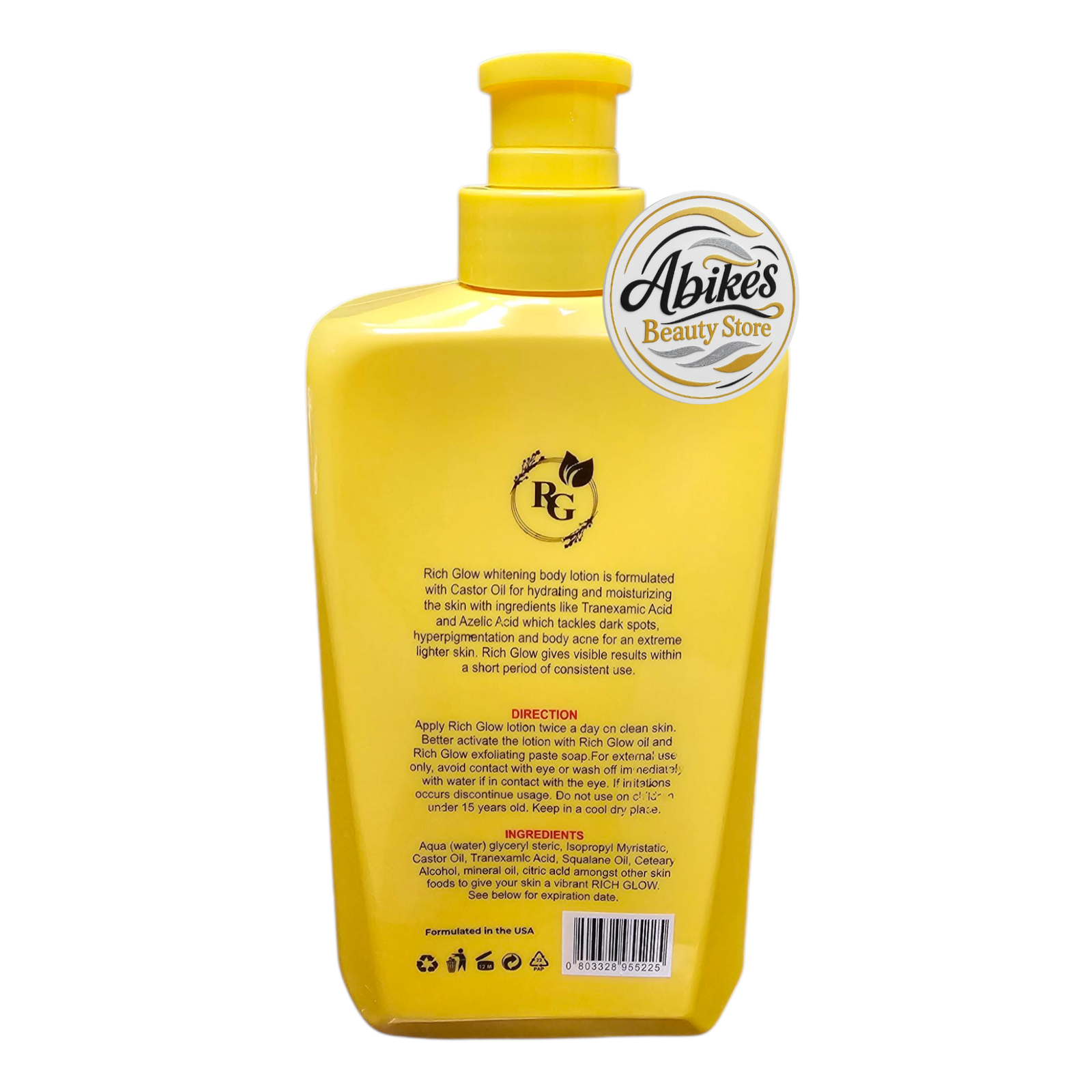 **Directions**: For best results, apply Rich Glow Lotion twice daily on clean skin. Activate the lotion’s full potential by pairing it with Rich Glow Oil and Rich Glow Exfoliating Paste Soap. For external use only; avoid contact with eyes and wash off immediately with water if contact occurs. Discontinue usage if irritation occurs. Not suitable for children under 15 years old. Store in a cool, dry place.